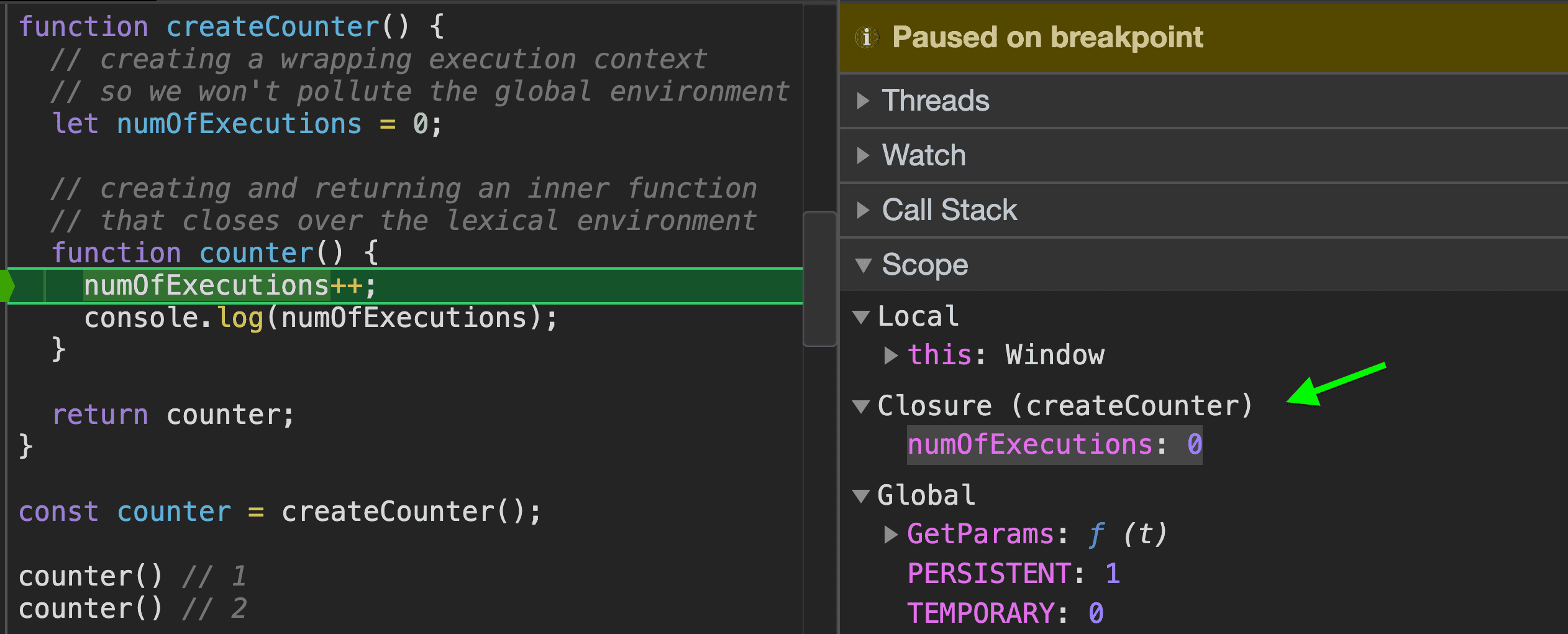 If we debug counter’s execution we can see in the developer-tools that numOfExecutions is not stored in the local variable environment of counter but in it’s “Closure” scope, (refers to as [[Scope]] in the spec).
